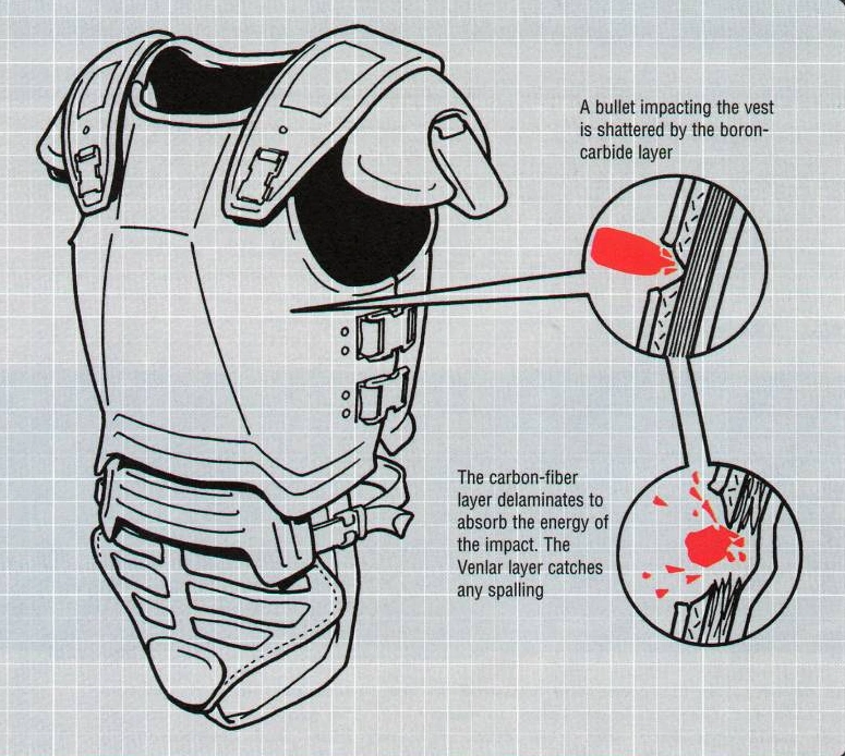 Az M3-ast több anyagból készítik, amit szendvics módjára egymásra helyeznek, hogy szilárd burkot adjanak. A külső réteg egy ultra-könnyű titánium-ötvözet, aminek célja, hogy megadja a szerkezeti szilárdságot és védjen a lézerek ellen. Eme réteg alatt található a páncél magja, a grafit-kompozit szénszálas réteg, amit egy réteg bór-kabrid gyanta ragaszt össze. A bór-kabrid hihetetlenül erős kerámiai anyag, amit arra terveztek, hogy összetörje a becsapódó lövedékeket, miközben felszívja annak energiáját. Alatta a szénszálas réteg ballisztikailag nyújt védelmet az eltalált ponton, ahol elnyeli a maradék energiát egy egészen nagy területen. Végül a páncél belsejében van a bélés, ami 1500 Venlar szálból készül. Ez a szövet elvezeti a fennmaradó energiát (deformálódik a területen) és képes felfogni a többi rétegen átjött repeszeket vagy lövedékeket. A lövések, vagy repesz által eltalált pontokat amint lehetséges, új rétegre kell kicserélni, hogy az M3 továbbra is ellássa funkcióját.