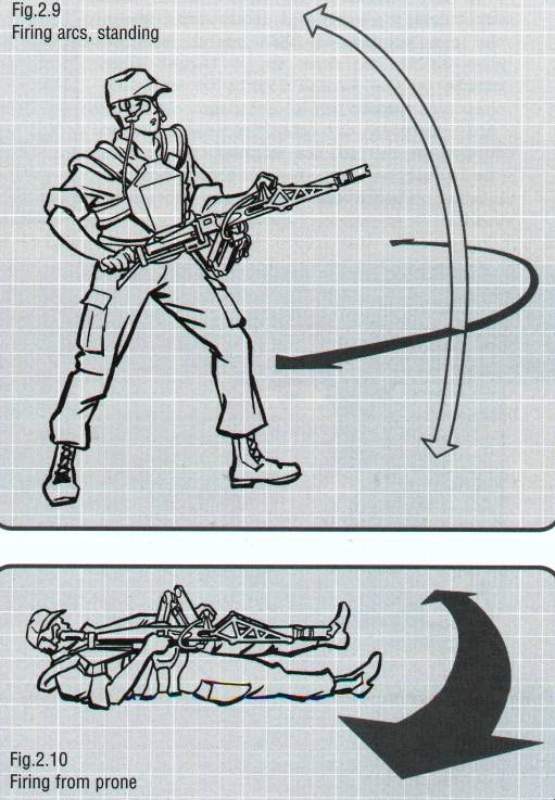 Állás közben a fegyvert a fogókar tartja, a kezelőnek nem kell vele bajlódnia, széles körben tudja forgatni a fegyvert vertikális és horizontális irányban. Ama esetben, mikor a kezelő fekszik, mindenképpen a hátán kell feküdjön, hogy tudja használni a fegyvert, mint az ábrán is látható. A fogókar giroszkóp stabilizált, illetve segít elnyelni a visszarúgást, így a kezelő pontosan lőhet akkor is, mikor járkál, vagy éppen rohan.