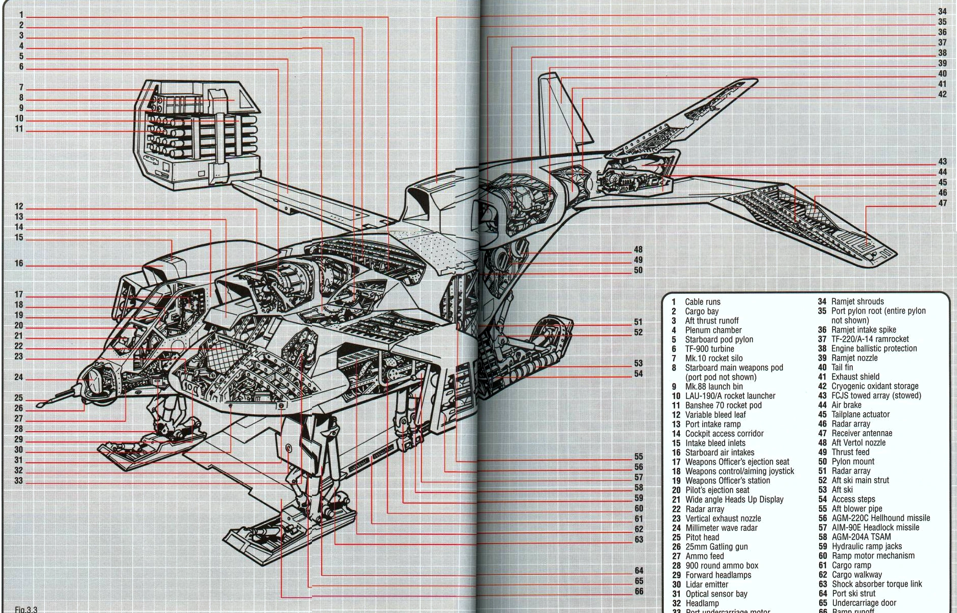 Az elülső raktér mindkét oldalán a strukturális háló kifelé terjeszkedik, hogy statikus feltöltőpontokat hozzon létre a futóműnek, az üzemanyagtanknak és másodlagos fegyverállványzatnak.